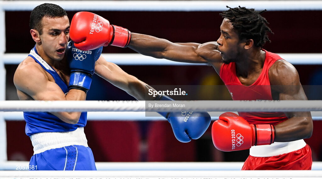 3 August 2021; Keyshawn Davis of USA, right, and Gamil Mamedov of Russian Olympic Committee during their men's lightweight quarter-final bout at the Kokugikan Arena during the 2020 Tokyo Summer Olympic Games in Tokyo, Japan. Photo by Brendan Moran/Sportsfile