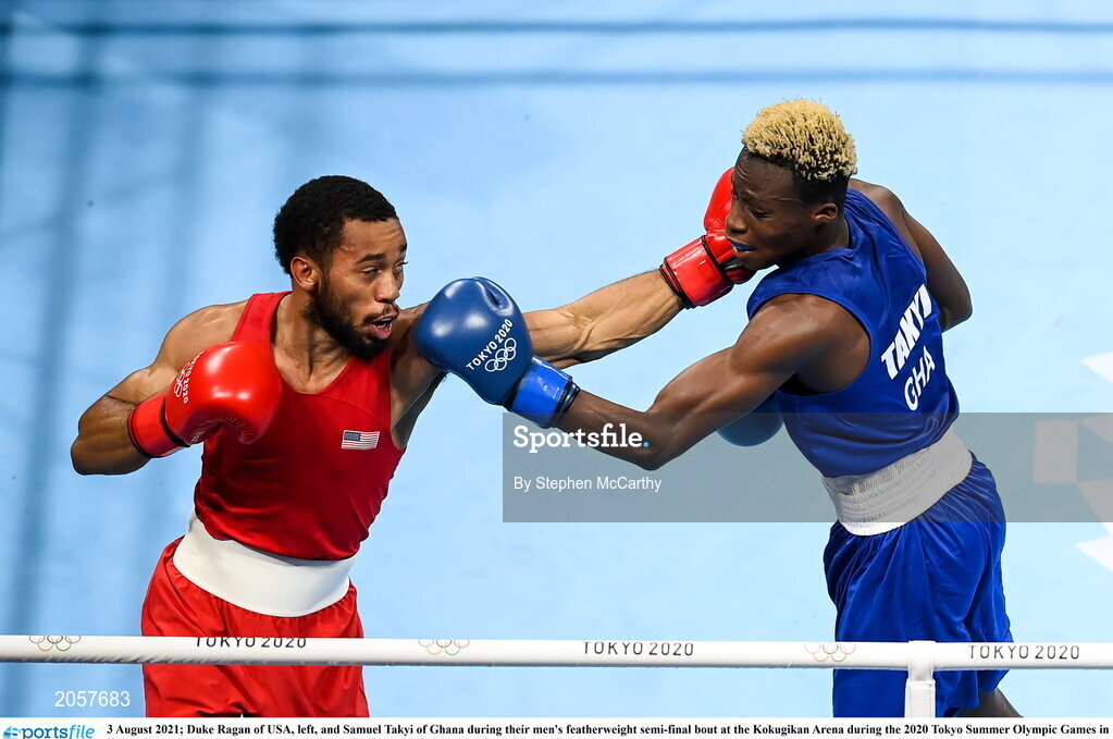 3 August 2021; Duke Ragan of USA, left, and Samuel Takyi of Ghana during their men's featherweight semi-final bout at the Kokugikan Arena during the 2020 Tokyo Summer Olympic Games in Tokyo, Japan. Photo by Stephen McCarthy/Sportsfile
