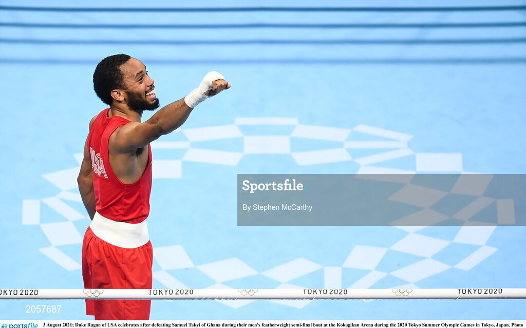 3 August 2021; Duke Ragan of USA celebrates after defeating Samuel Takyi of Ghana during their men's featherweight semi-final bout at the Kokugikan Arena during the 2020 Tokyo Summer Olympic Games in Tokyo, Japan. Photo by Stephen McCarthy/Sportsfile