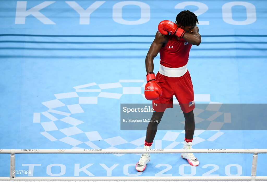 3 August 2021; Keyshawn Davis of USA after defeating Gamil Mamedov of Russian Olympic Committee in their men's lightweight quarter-final bout at the Kokugikan Arena during the 2020 Tokyo Summer Olympic Games in Tokyo, Japan. Photo by Stephen McCarthy/Sportsfile