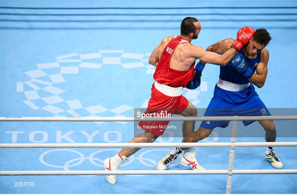 3 August 2021; Muslim Gadzhimagomedov of Russian Olympic Commitee, left, and David Nyika of New Zealand during their men's heavyweight bout at the Kokugikan Arena during the 2020 Tokyo Summer Olympic Games in Tokyo, Japan. Photo by Stephen McCarthy/Sportsfile