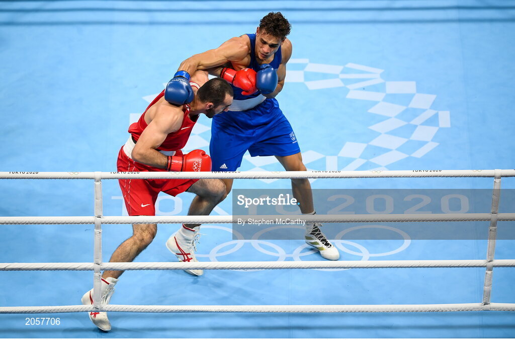3 August 2021; Muslim Gadzhimagomedov of Russian Olympic Commitee, left, and David Nyika of New Zealand during their men's heavyweight bout at the Kokugikan Arena during the 2020 Tokyo Summer Olympic Games in Tokyo, Japan. Photo by Stephen McCarthy/Sportsfile