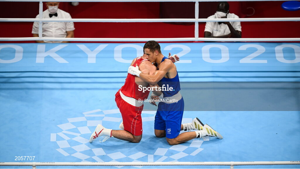 3 August 2021; Muslim Gadzhimagomedov of Russian Olympic Commitee, left, and David Nyika of New Zealand embrace after their men's heavyweight bout at the Kokugikan Arena during the 2020 Tokyo Summer Olympic Games in Tokyo, Japan. Photo by Stephen McCarthy/Sportsfile