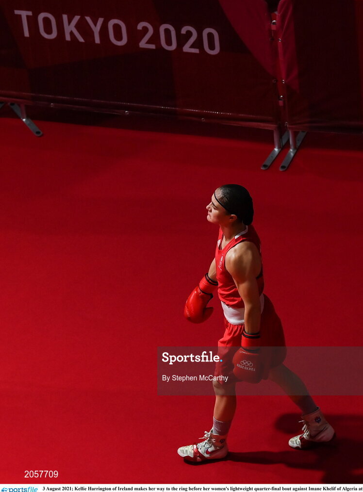 3 August 2021; Kellie Harrington of Ireland makes her way to the ring before her women's lightweight quarter-final bout against Imane Khelif of Algeria at the Kokugikan Arena during the 2020 Tokyo Summer Olympic Games in Tokyo, Japan. Photo by Stephen McCarthy/Sportsfile