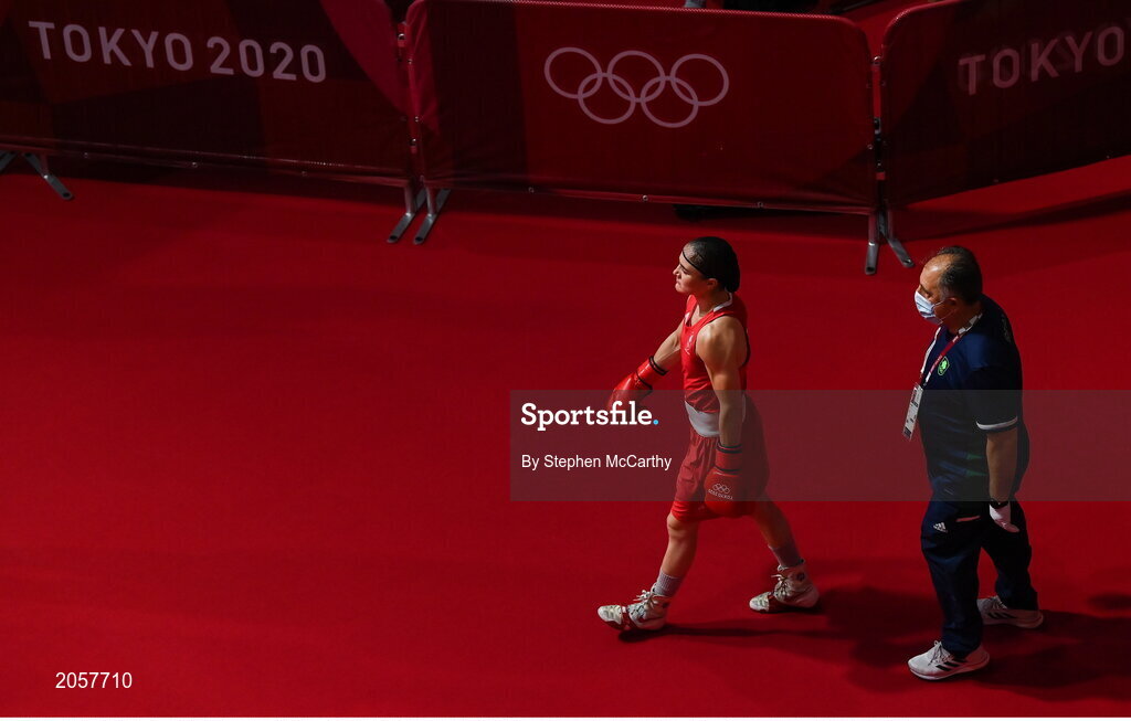 3 August 2021; Kellie Harrington of Ireland makes her way to the ring before her women's lightweight quarter-final bout against Imane Khelif of Algeria at the Kokugikan Arena during the 2020 Tokyo Summer Olympic Games in Tokyo, Japan. Photo by Stephen McCarthy/Sportsfile
