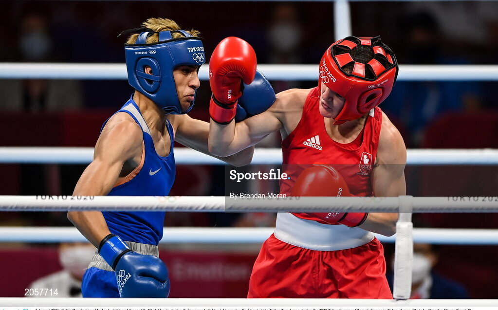 3 August 2021; Kellie Harrington of Ireland, right, and Imane Khelif of Algeria during their women's lightweight quarter-final bout at the Kokugikan Arena during the 2020 Tokyo Summer Olympic Games in Tokyo, Japan. Photo by Brendan Moran/Sportsfile