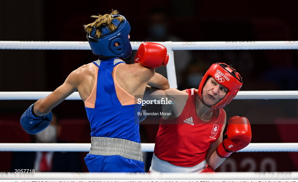 3 August 2021; Kellie Harrington of Ireland, right, and Imane Khelif of Algeria during their women's lightweight quarter-final bout at the Kokugikan Arena during the 2020 Tokyo Summer Olympic Games in Tokyo, Japan. Photo by Brendan Moran/Sportsfile