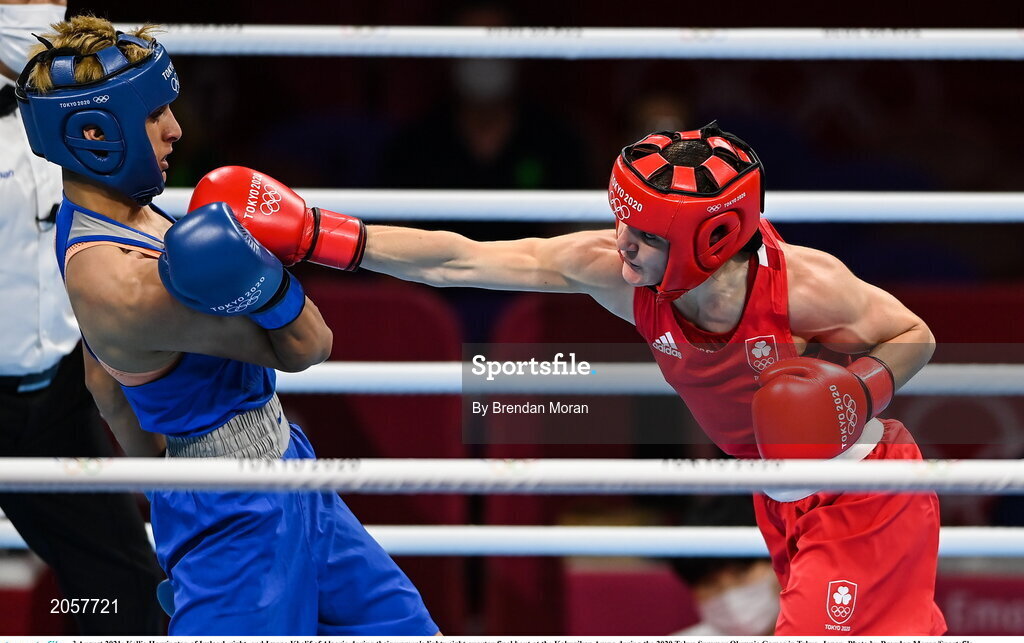 3 August 2021; Kellie Harrington of Ireland, right, and Imane Khelif of Algeria during their women's lightweight quarter-final bout at the Kokugikan Arena during the 2020 Tokyo Summer Olympic Games in Tokyo, Japan. Photo by Brendan Moran/Sportsfile