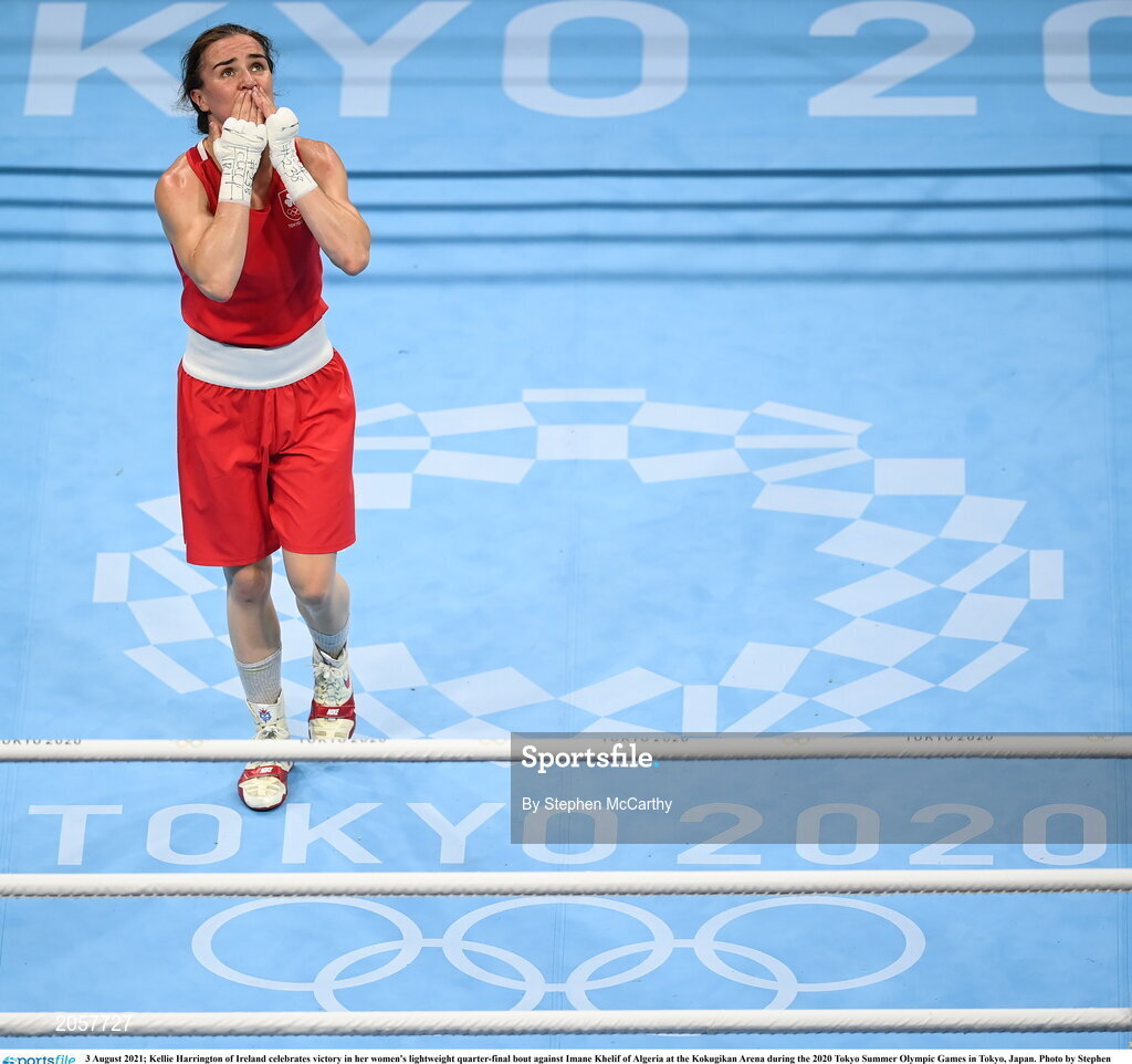 3 August 2021; Kellie Harrington of Ireland celebrates victory in her women's lightweight quarter-final bout against Imane Khelif of Algeria at the Kokugikan Arena during the 2020 Tokyo Summer Olympic Games in Tokyo, Japan. Photo by Stephen McCarthy/Sportsfile