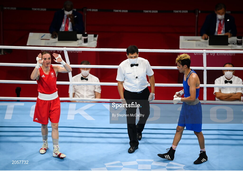 3 August 2021; Kellie Harrington of Ireland, left, is declared victorious in her women's lightweight quarter-final bout against Imane Khelif of Algeria at the Kokugikan Arena during the 2020 Tokyo Summer Olympic Games in Tokyo, Japan. Photo by Stephen McCarthy/Sportsfile
