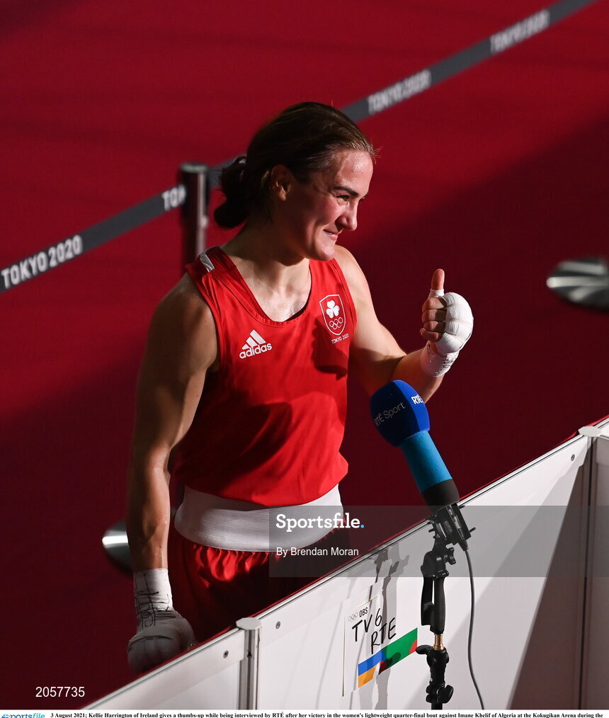 3 August 2021; Kellie Harrington of Ireland gives a thumbs-up while being interviewed by RTÉ after her victory in the women's lightweight quarter-final bout against Imane Khelif of Algeria at the Kokugikan Arena during the 2020 Tokyo Summer Olympic Games in Tokyo, Japan. Photo by Brendan Moran/Sportsfile