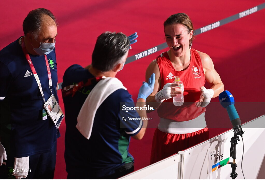 3 August 2021; Kellie Harrington of Ireland with coaches John Conlan, centre, and Zaur Antia after her victory in the women's lightweight quarter-final bout against Imane Khelif of Algeria at the Kokugikan Arena during the 2020 Tokyo Summer Olympic Games in Tokyo, Japan. Photo by Brendan Moran/Sportsfile
