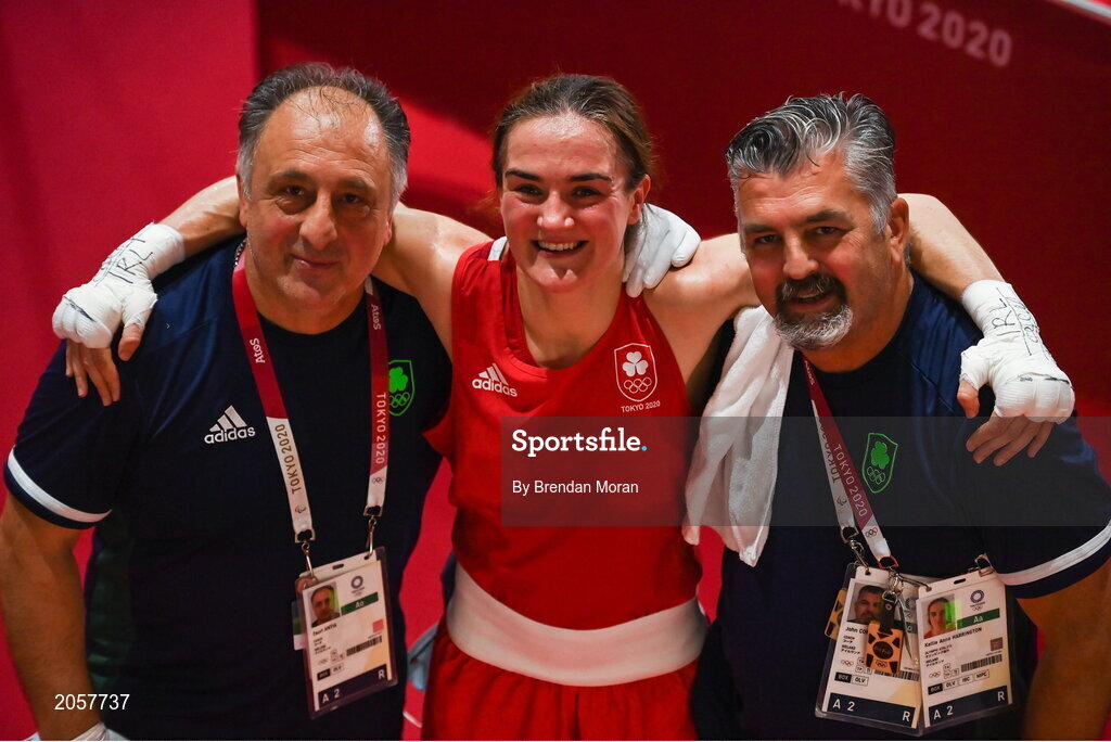 3 August 2021; Kellie Harrington of Ireland with coaches John Conlan, right, and Zaur Antia after her victory in the women's lightweight quarter-final bout against Imane Khelif of Algeria at the Kokugikan Arena during the 2020 Tokyo Summer Olympic Games in Tokyo, Japan. Photo by Brendan Moran/Sportsfile