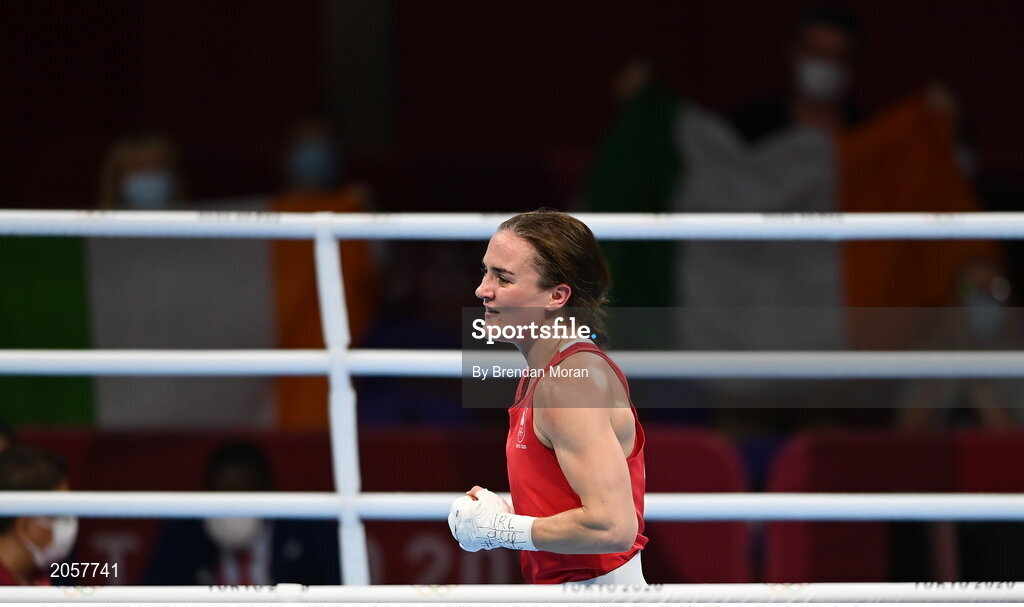3 August 2021; Kellie Harrington of Ireland celebrates after her victory in the women's lightweight quarter-final bout against Imane Khelif of Algeria at the Kokugikan Arena during the 2020 Tokyo Summer Olympic Games in Tokyo, Japan. Photo by Brendan Moran/Sportsfile