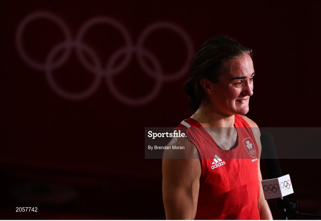3 August 2021; Kellie Harrington of Ireland after her victory in the women's lightweight quarter-final bout against Imane Khelif of Algeria at the Kokugikan Arena during the 2020 Tokyo Summer Olympic Games in Tokyo, Japan. Photo by Brendan Moran/Sportsfile