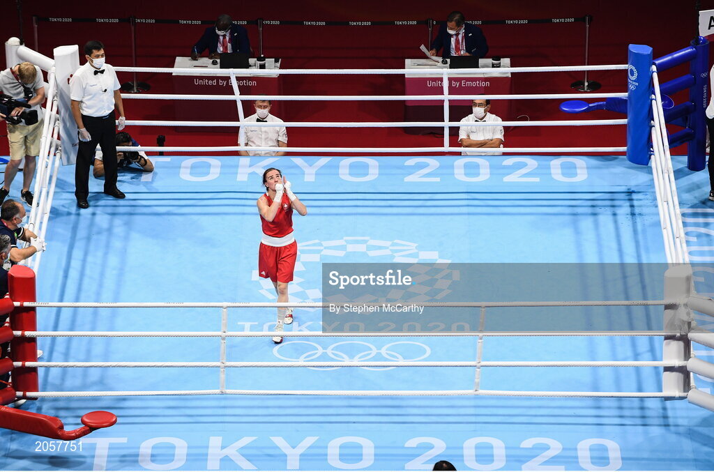 3 August 2021; Kellie Harrington of Ireland celebrates victory in her women's lightweight quarter-final bout against Imane Khelif of Algeria at the Kokugikan Arena during the 2020 Tokyo Summer Olympic Games in Tokyo, Japan. Photo by Stephen McCarthy/Sportsfile