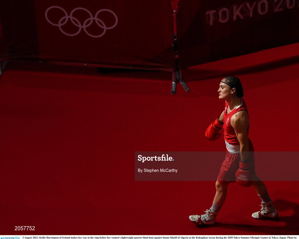 3 August 2021; Kellie Harrington of Ireland makes her way to the ring before her women's lightweight quarter-final bout against Imane Khelif of Algeria at the Kokugikan Arena during the 2020 Tokyo Summer Olympic Games in Tokyo, Japan. Photo by Stephen McCarthy/Sportsfile