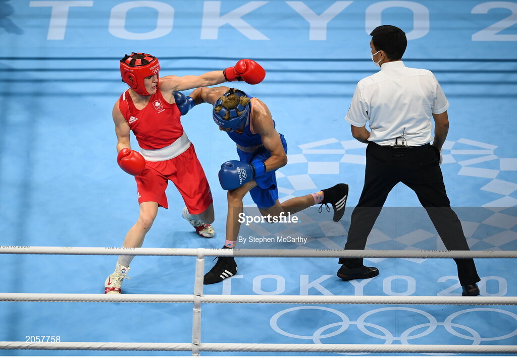 3 August 2021; Kellie Harrington of Ireland, left, and Imane Khelif of Algeria during their women's lightweight quarter-final bout at the Kokugikan Arena during the 2020 Tokyo Summer Olympic Games in Tokyo, Japan. Photo by Stephen McCarthy/Sportsfile