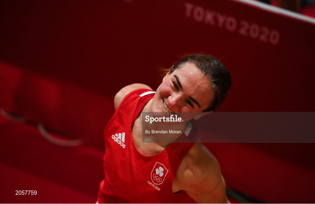 3 August 2021; Kellie Harrington of Ireland celebrates victory over Imane Khelif of Algeria in their women's lightweight quarter-final bout at the Kokugikan Arena during the 2020 Tokyo Summer Olympic Games in Tokyo, Japan. Photo by Brendan Moran/Sportsfile