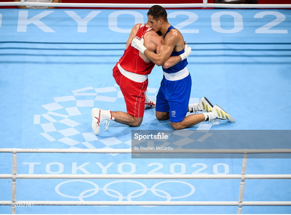 3 August 2021; Muslim Gadzhimagomedov of Russian Olympic Commitee, left, and David Nyika of New Zealand embrace after their men's heavyweight bout at the Kokugikan Arena during the 2020 Tokyo Summer Olympic Games in Tokyo, Japan. Photo by Stephen McCarthy/Sportsfile
