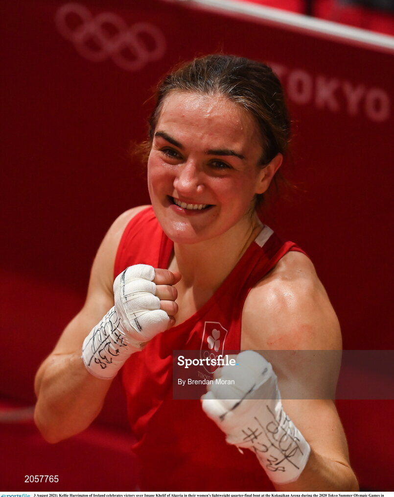 3 August 2021; Kellie Harrington of Ireland celebrates victory over Imane Khelif of Algeria in their women's lightweight quarter-final bout at the Kokugikan Arena during the 2020 Tokyo Summer Olympic Games in Tokyo, Japan. Photo by Brendan Moran/Sportsfile
