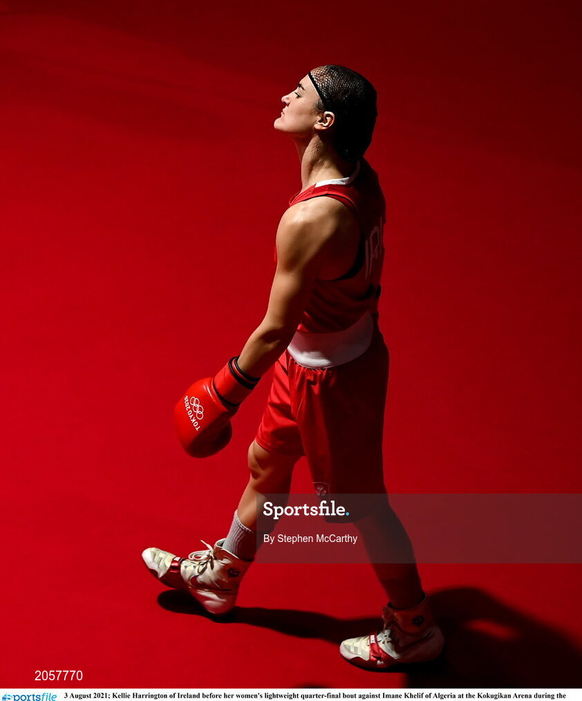 3 August 2021; Kellie Harrington of Ireland before her women's lightweight quarter-final bout against Imane Khelif of Algeria at the Kokugikan Arena during the 2020 Tokyo Summer Olympic Games in Tokyo, Japan. Photo by Stephen McCarthy/Sportsfile