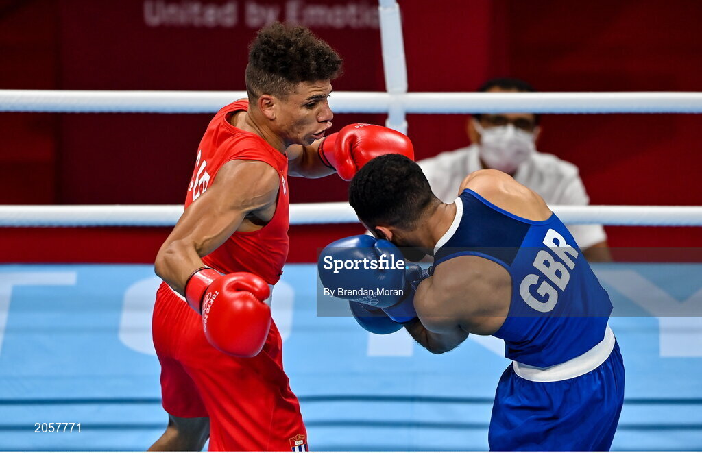 3 August 2021; Yosbany Veitia of Cuba, left, and Galal Yafai of Great Britain during their men's flyweight quarter-final bout at the Kokugikan Arena during the 2020 Tokyo Summer Olympic Games in Tokyo, Japan. Photo by Brendan Moran/Sportsfile