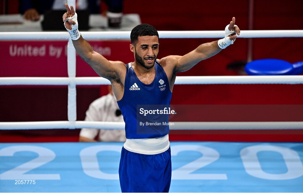 3 August 2021; Galal Yafai of Great Britain celebrates victory over Yosbany Veitia of Cuba following their men's flyweight quarter-final bout at the Kokugikan Arena during the 2020 Tokyo Summer Olympic Games in Tokyo, Japan. Photo by Brendan Moran/Sportsfile