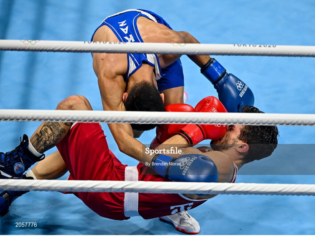 3 August 2021; Gabriel Escobar Mascunano of Spain, bottom, and Saken Bibossinov of Kazakhstan fall to the canvas during their men's flyweight quarter-final bout at the Kokugikan Arena during the 2020 Tokyo Summer Olympic Games in Tokyo, Japan. Photo by Brendan Moran/Sportsfile