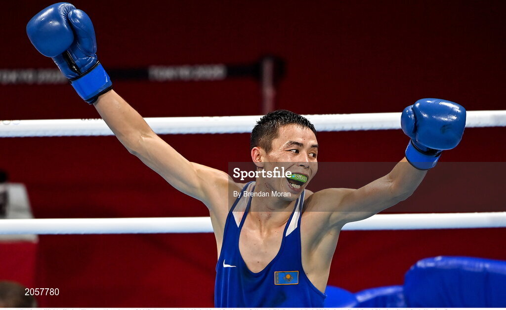 3 August 2021; Saken Bibossinov of Kazakhstan celebrates victory over Gabriel Escobar Mascunano of Spain following their men's flyweight quarter-final bout at the Kokugikan Arena during the 2020 Tokyo Summer Olympic Games in Tokyo, Japan. Photo by Brendan Moran/Sportsfile