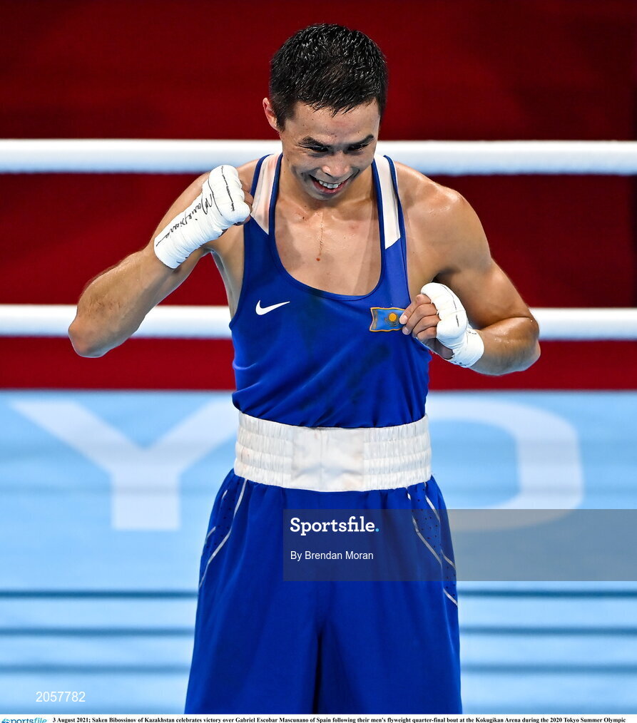 3 August 2021; Saken Bibossinov of Kazakhstan celebrates victory over Gabriel Escobar Mascunano of Spain following their men's flyweight quarter-final bout at the Kokugikan Arena during the 2020 Tokyo Summer Olympic Games in Tokyo, Japan. Photo by Brendan Moran/Sportsfile