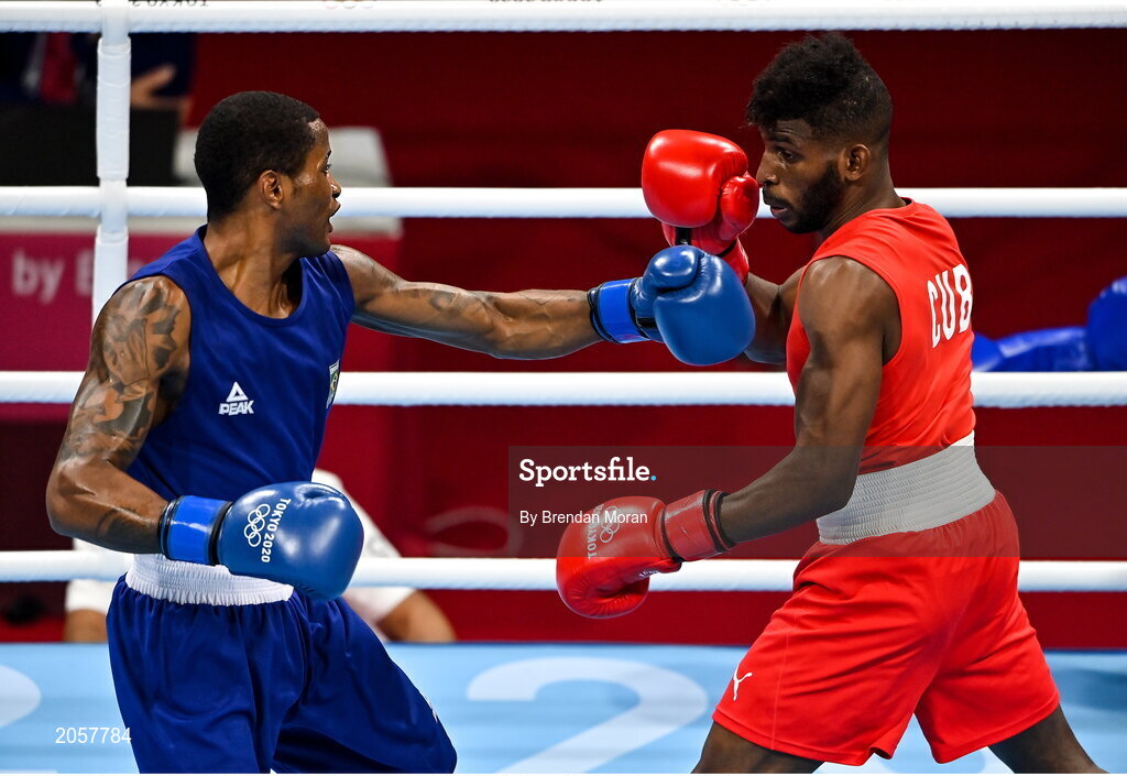 3 August 2021; Wanderson de Oliveira of Brazil, left, and Andy Cruz of Cuba during their men's lightweight quarter-final bout at the Kokugikan Arena during the 2020 Tokyo Summer Olympic Games in Tokyo, Japan. Photo by Brendan Moran/Sportsfile