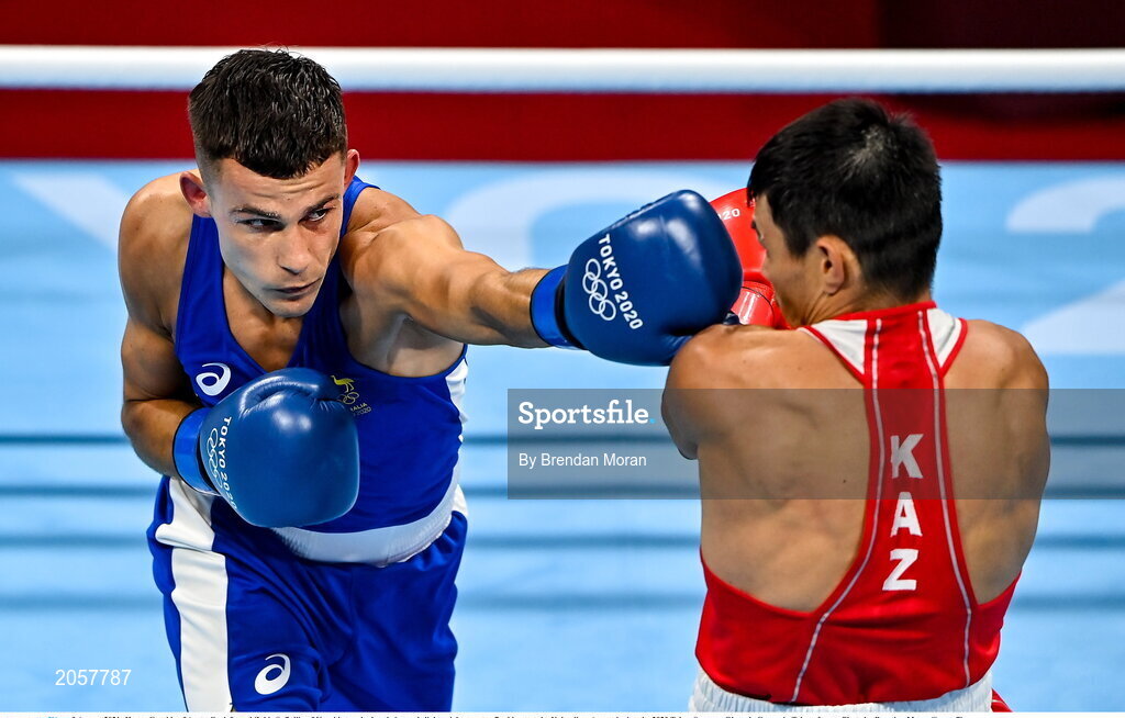 3 August 2021; Harry Garside of Australia, left, and Zakir Safiullin of Kazakhstan during their men's lightweight quarter-final bout at the Kokugikan Arena during the 2020 Tokyo Summer Olympic Games in Tokyo, Japan. Photo by Brendan Moran/Sportsfile