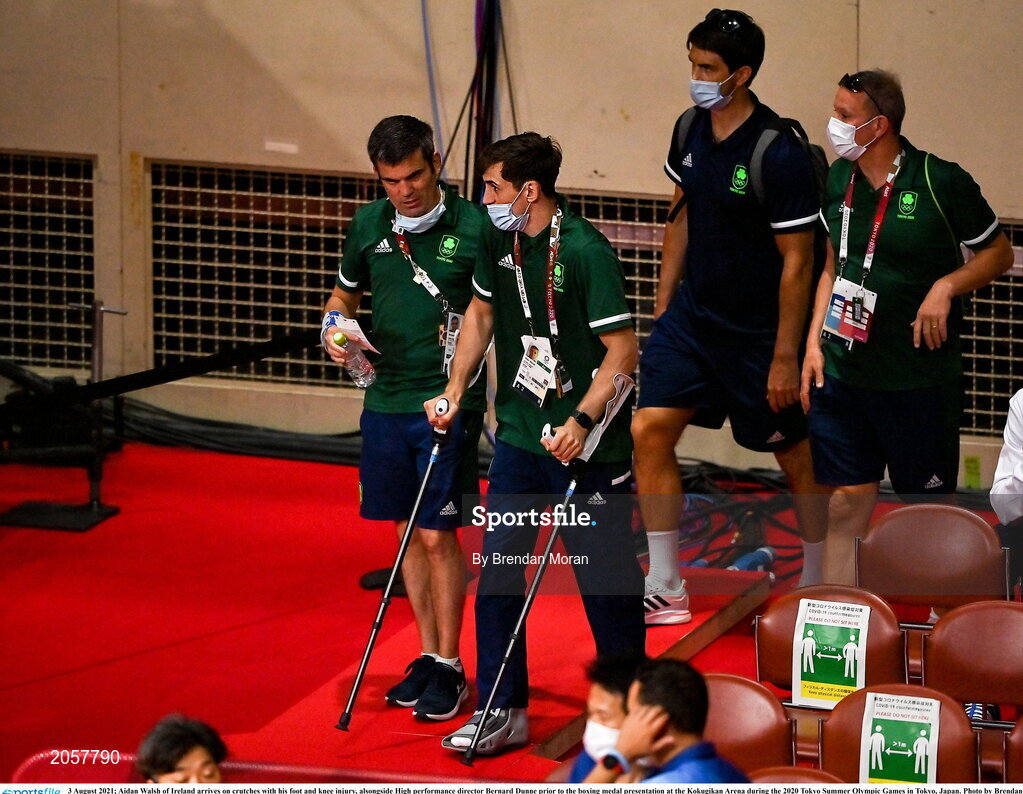 3 August 2021; Aidan Walsh of Ireland arrives on crutches with his foot and knee injury, alsongside High performance director Bernard Dunne prior to the boxing medal presentation at the Kokugikan Arena during the 2020 Tokyo Summer Olympic Games in Tokyo, Japan. Photo by Brendan Moran/Sportsfile
