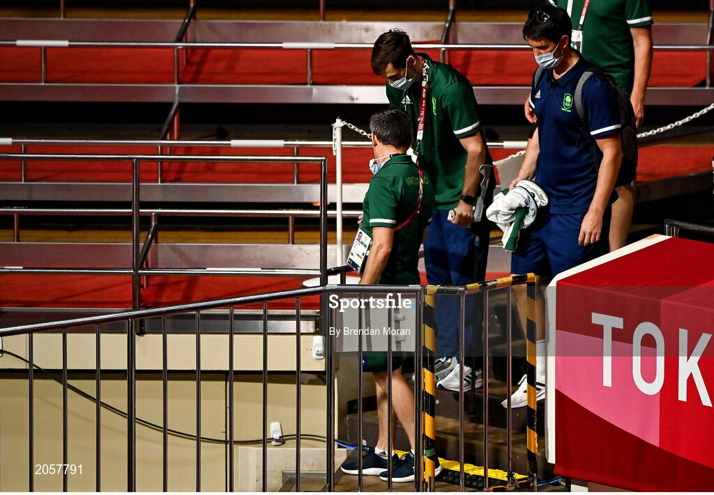 3 August 2021; Aidan Walsh of Ireland arrives on crutches with his foot and knee injury prior to the boxing medal presentation at the Kokugikan Arena during the 2020 Tokyo Summer Olympic Games in Tokyo, Japan. Photo by Brendan Moran/Sportsfile