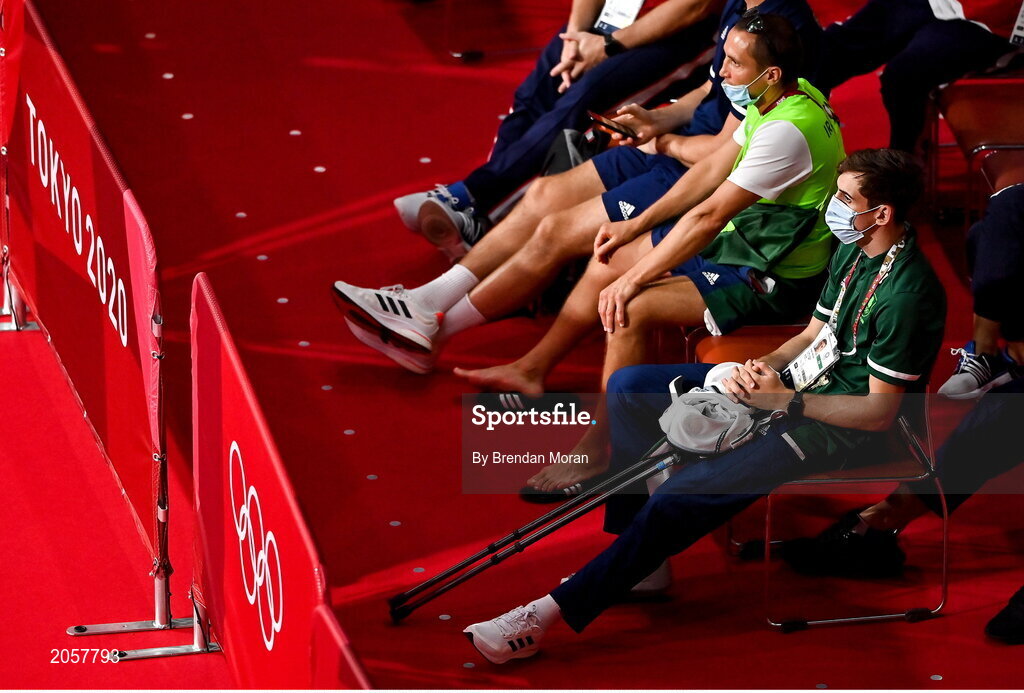 3 August 2021; Aidan Walsh of Ireland sits with his injured foot in a boot prior to the boxing medal presentation at the Kokugikan Arena during the 2020 Tokyo Summer Olympic Games in Tokyo, Japan. Photo by Brendan Moran/Sportsfile
