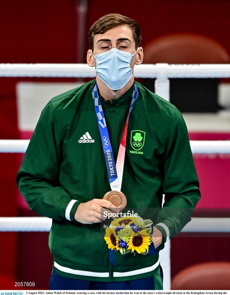 3 August 2021; Aidan Walsh of Ireland, wearing a cast, with his bronze medal that he won in the men's welterweight division at the Kokugikan Arena during the 2020 Tokyo Summer Olympic Games in Tokyo, Japan. Photo by Brendan Moran/Sportsfile