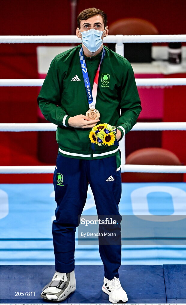 3 August 2021; Aidan Walsh of Ireland, wearing a cast, with his bronze medal that he won in the men's welterweight division at the Kokugikan Arena during the 2020 Tokyo Summer Olympic Games in Tokyo, Japan. Photo by Brendan Moran/Sportsfile