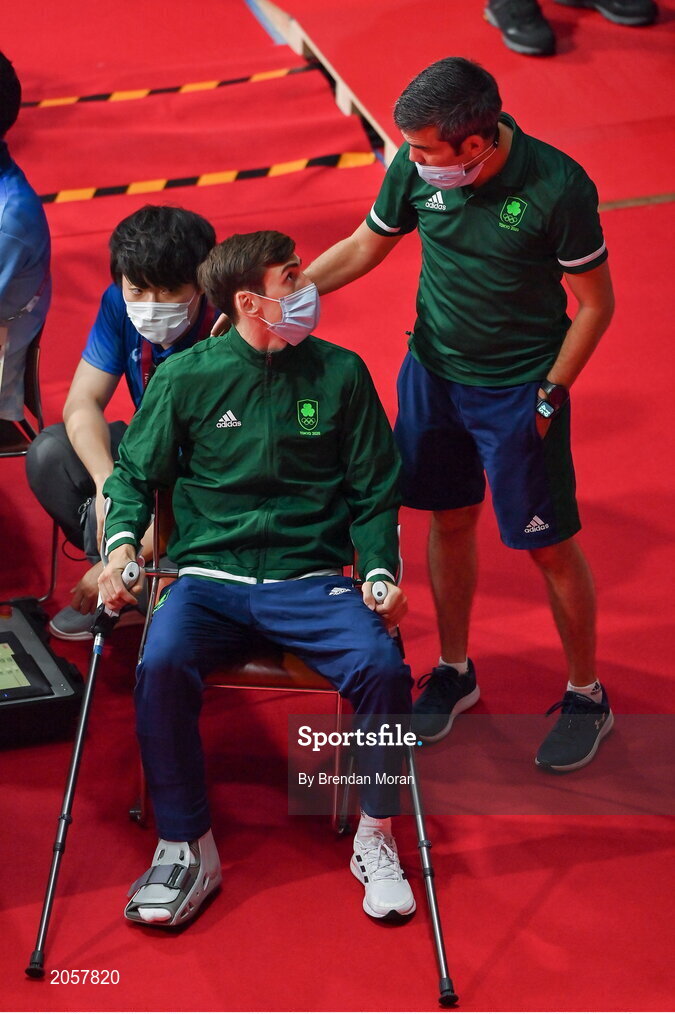 3 August 2021; Aidan Walsh of Ireland, wearing a cast, ahead of the medal ceremony with High performance director Bernard Dunne at the Kokugikan Arena during the 2020 Tokyo Summer Olympic Games in Tokyo, Japan. Photo by Brendan Moran/Sportsfile