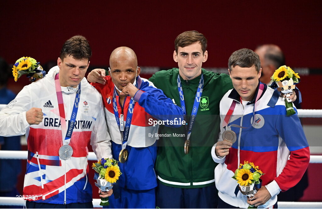 3 August 2021; Aidan Walsh of Ireland with his bronze medal that he won in the men's welterweight division with silver medalist Pat McCormack of Great Britain, left, gold medalist Roniel Iglesias of Cuba, and bronze medalist Andrei Zamkovoi of Russian Olympic Committee at the Kokugikan Arena during the 2020 Tokyo Summer Olympic Games in Tokyo, Japan. Photo by Brendan Moran/Sportsfile