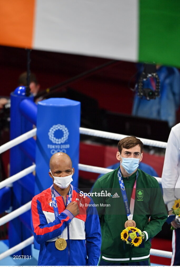 3 August 2021; Bronze medalist Aidan Walsh of Ireland, alongside gold medalist Roniel Iglesias of Cuba, looks up as the tri-colour is raised during men's welterweight division medal ceremony at the Kokugikan Arena during the 2020 Tokyo Summer Olympic Games in Tokyo, Japan. Photo by Brendan Moran/Sportsfile
