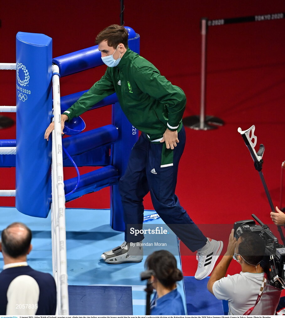 3 August 2021; Aidan Walsh of Ireland, wearing a cast, climbs into the ring before accepting his bronze medal that he won in the men's welterweight division at the Kokugikan Arena during the 2020 Tokyo Summer Olympic Games in Tokyo, Japan. Photo by Brendan Moran/Sportsfile