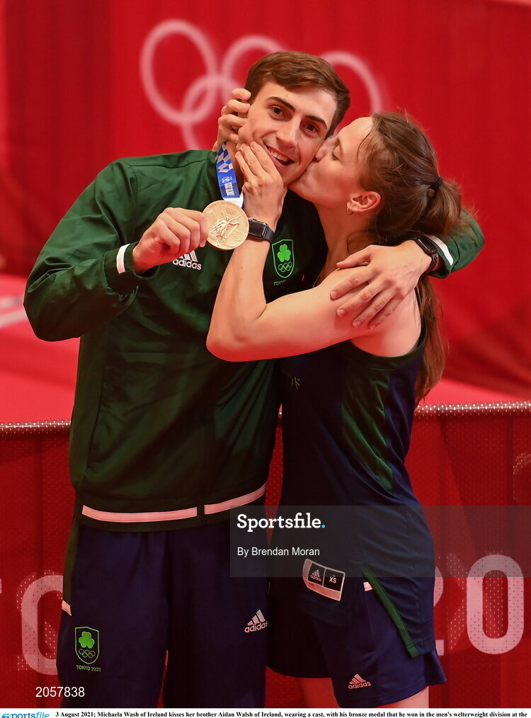 3 August 2021; Michaela Walsh of Ireland kisses her brother Aidan Walsh of Ireland, wearing a cast, with his bronze medal that he won in the men's welterweight division at the Kokugikan Arena during the 2020 Tokyo Summer Olympic Games in Tokyo, Japan. Photo by Brendan Moran/Sportsfile