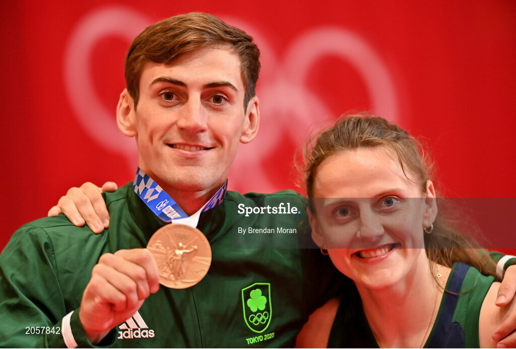 3 August 2021; Bronze medalist Aidan Walsh of Ireland with his sister Michaela Walsh after the men's welterweight division medal ceremony at the Kokugikan Arena during the 2020 Tokyo Summer Olympic Games in Tokyo, Japan. Photo by Brendan Moran/Sportsfile