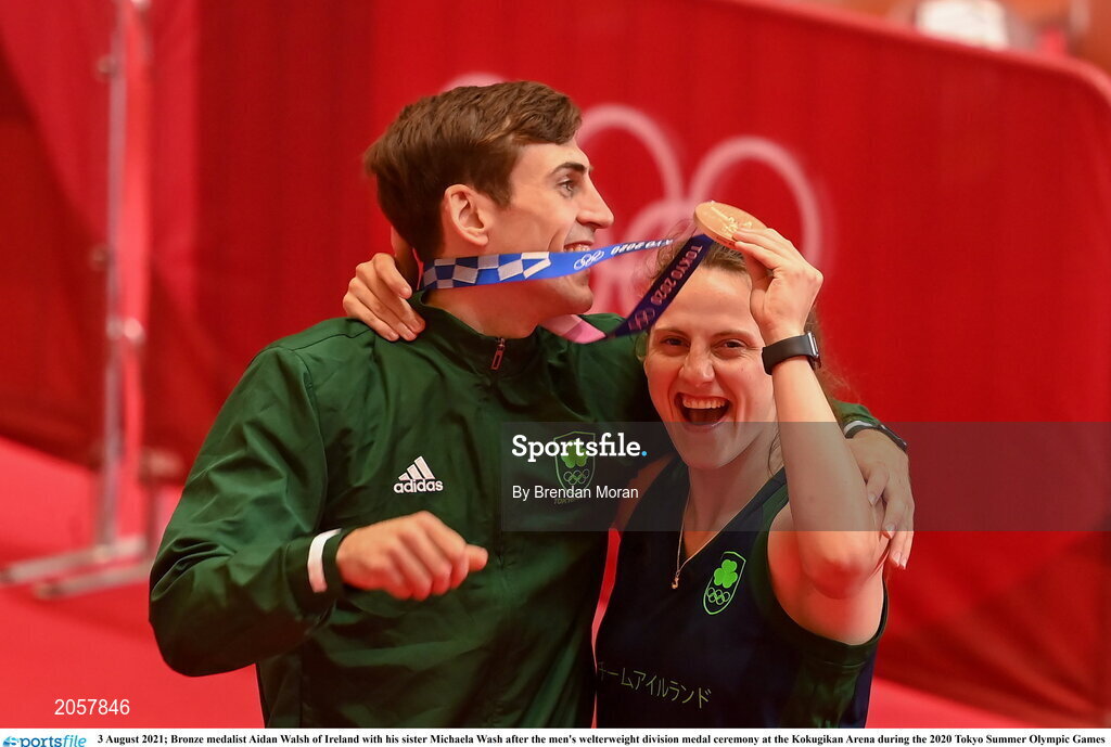 3 August 2021; Bronze medalist Aidan Walsh of Ireland with his sister Michaela Walsh after the men's welterweight division medal ceremony at the Kokugikan Arena during the 2020 Tokyo Summer Olympic Games in Tokyo, Japan. Photo by Brendan Moran/Sportsfile