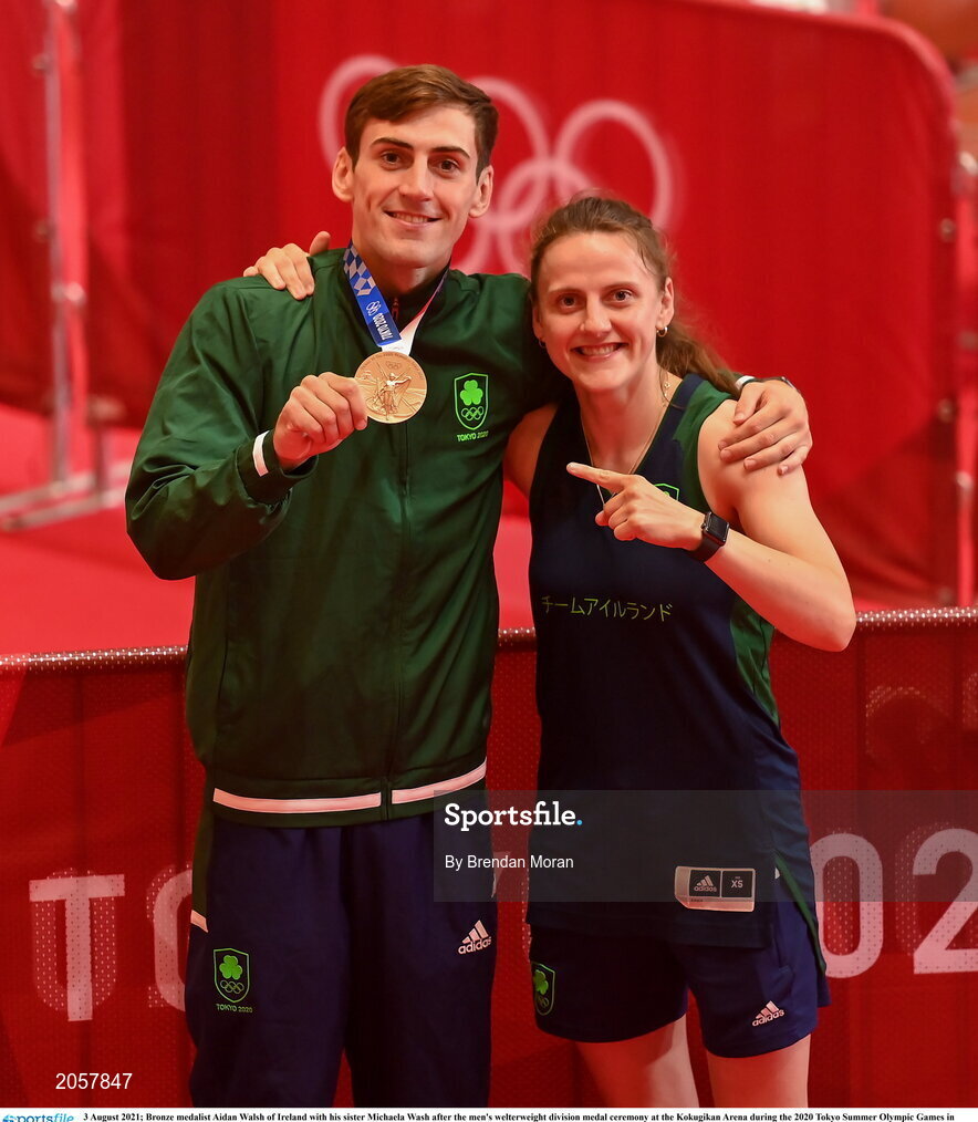 3 August 2021; Bronze medalist Aidan Walsh of Ireland with his sister Michaela Walsh after the men's welterweight division medal ceremony at the Kokugikan Arena during the 2020 Tokyo Summer Olympic Games in Tokyo, Japan. Photo by Brendan Moran/Sportsfile