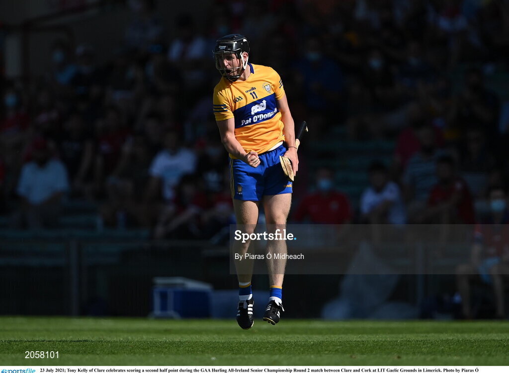 23 July 2021; Tony Kelly of Clare celebrates scoring a second half point during the GAA Hurling All-Ireland Senior Championship Round 2 match between Clare and Cork at LIT Gaelic Grounds in Limerick. Photo by Piaras Ó Mídheach/Sportsfile