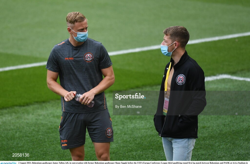 3 August 2021; Bohemians goalkeeper James Talbot, left, in conversation with former Bohemians goalkeeper Shane Supple before the UEFA Europa Conference League third qualifying round first leg match between Bohemians and PAOK at Aviva Stadium in Dublin. Photo by Ben McShane/Sportsfile
