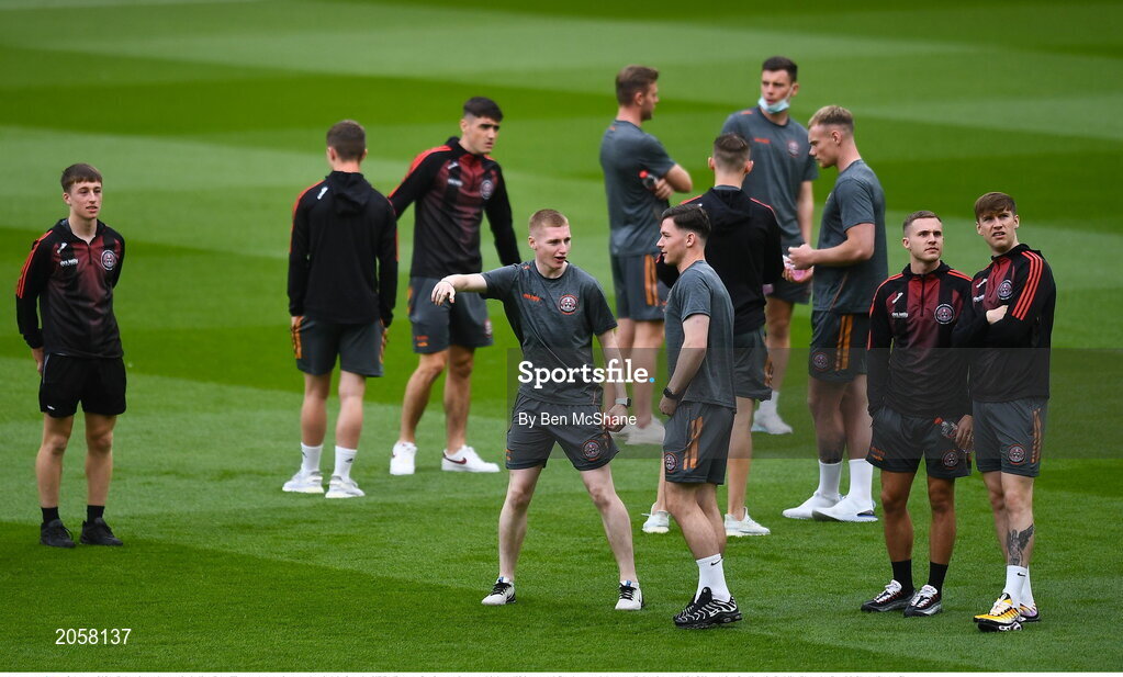 3 August 2021; Bohemians players, including Ross Tierney, centre, inspect the pitch before the UEFA Europa Conference League third qualifying round first leg match between Bohemians and PAOK at Aviva Stadium in Dublin. Photo by Ben McShane/Sportsfile