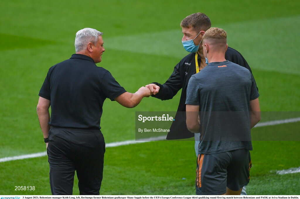 3 August 2021; Bohemians manager Keith Long, left, fist-bumps former Bohemians goalkeeper Shane Supple before the UEFA Europa Conference League third qualifying round first leg match between Bohemians and PAOK at Aviva Stadium in Dublin. Photo by Ben McShane/Sportsfile